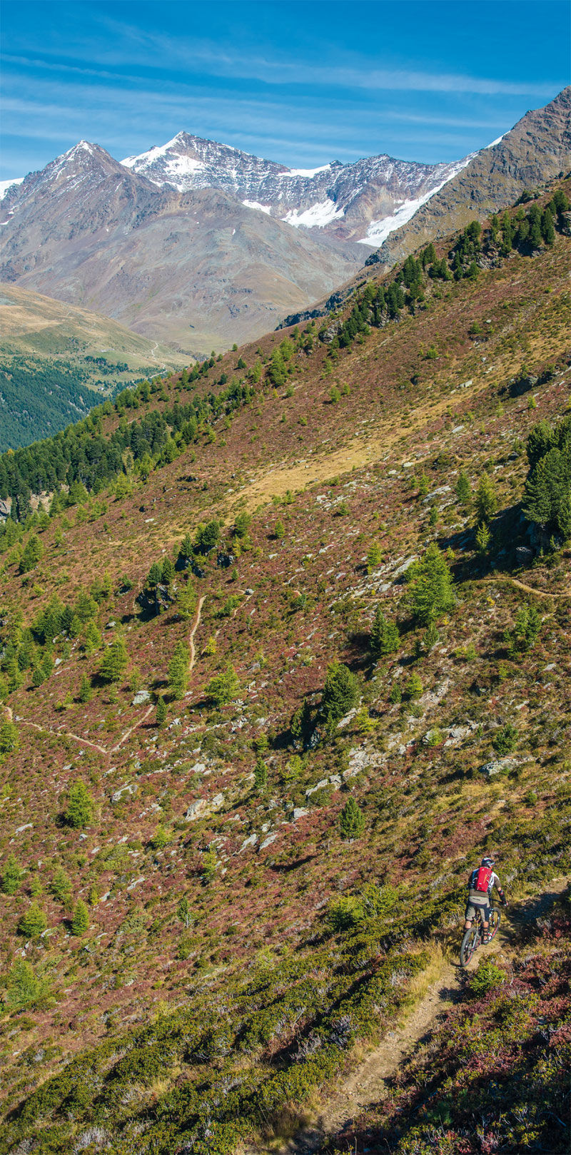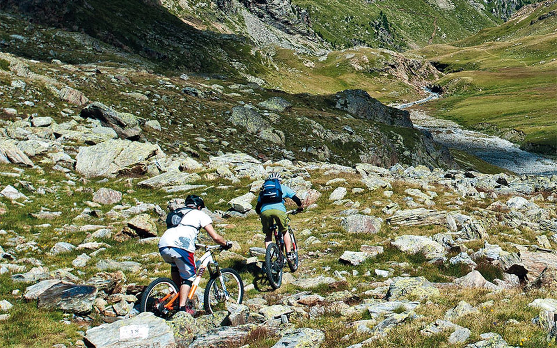 Sotto il Rifugio Berni Val di Gavia 2540 m verso est si scende su sterrata, si attraversa il ponte e si va subito a sinistra cartello con segnavia n. 525. Inizia il lungo sentiero che porta a valle sul lato destro orografico con molti saliscendi. Quasi subito si attraversa lo splendido Ponte di Pietra sul Rio Dosegu' e si prosegue lungo la forra del torrente Gavia. Quindi, dopo essere passati davanti alla Baita dei Pastori 2446 m, ci si trova di fronte a un bivio 2430 m: sulla sinistra l'itinerario n. 556 scende direttamente al Ponte delle Vacche e a S. Caterina, mentre verso nord si prosegue a mezzacosta sull'itinerario n. 525 in direzione del pannello ripetitore per giungere al Dosso Tresero 2356 m. Qui troviamo il cartello con la scritta La Romantica, una comoda panchina in legno per ammirare lo splendido panorama sulla Valfurva e l'indicazione per scendere a Santa Caterina lungo il ripido sentiero nel bosco n. 561. L'alternativa piu' facile e' verso l'Alpe Tresero in direzione sud per 3,6 km fino al Ponte delle Vacche 2012 m e alla Provinciale del Gavia sul sopraccitato itinerario n. 556.