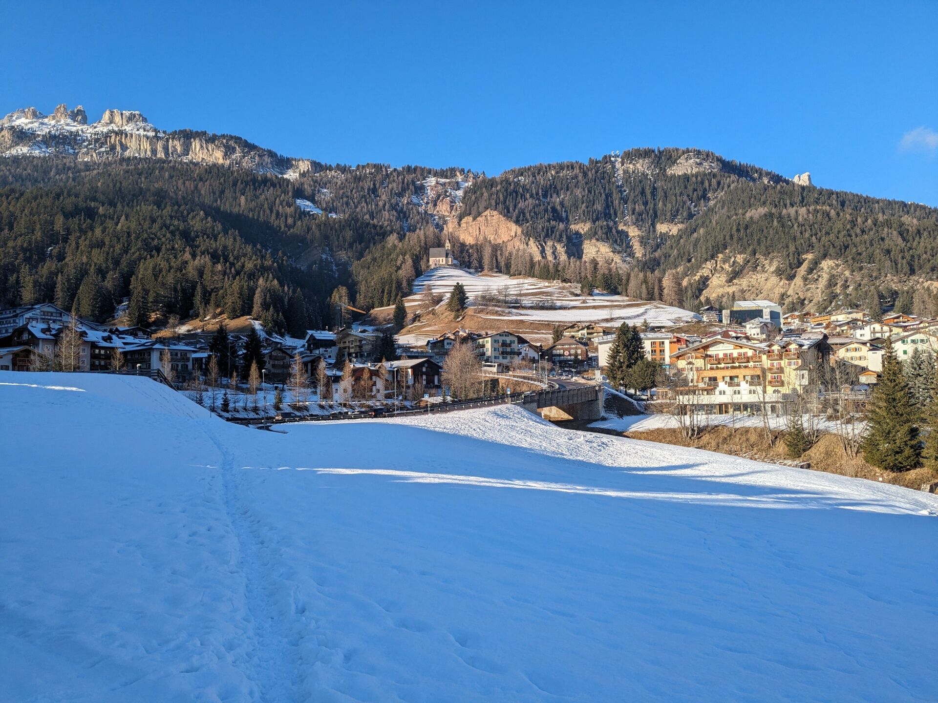 Partendo dall'ufficio turistico in Strada Rezia, dirigiti in direzione del Passo Carezza/Costalunga fino a raggiungere il ponte sul rio Ruf de Vael. Qui, imbocca sulla destra Strada de Pontac, che risale lungo l’argine del torrente. Dopo l'ultima abitazione, continua su una strada sterrata. Al primo bivio mantieni la sinistra e supera la passerella sul ruscello poco più a monte. Un bel tratto panoramico del sentiero conduce a un avvallamento. Prosegui in leggera salita e poi su terreno pianeggiante fino a raggiungere un’area attrezzata con panchine, tavoli e giochi per bambini. Sul lato opposto della radura, scendi a sinistra lungo la strada asfaltata fino a congiungerti con la stradina che porta a Valongia. Da qui, dirigiti verso l’abitato e sali alla chiesetta di San Giovanni Nepomuceno. Svolta a sinistra, attraversa obliquamente la strada statale e scendi verso le vallette delle "Grave", una serie di piccole valli attraversate da ruscelli. Questi vanno superati con attenzione, soprattutto in presenza di tratti ghiacciati. Dopo il secondo ruscello, prosegui mantenendoti sulla destra e sali con pendenza regolare fino a raggiungere una strada sterrata, che segui verso destra: in pochi minuti arriverai a Tamion, dove potrai godere di una straordinaria vista sulla Val di Fassa e sui monti circostanti. Dalla chiesa, segui Strada de Tamion verso la parte sud dell'abitato, passando tra le case rurali. Svolta a sinistra e imbocca il sentiero in direzione di Vigo. Attraversa il ponticello in legno sul Ruf de Pociole e prosegui fino alla frazione di Larcioné. Entra in Strada de Pociole, svolta a destra e subito dopo a sinistra, lasciandoti alle spalle le ultime abitazioni. Immettiti sulla stradina di campagna che proviene da Soraga. Da qui, svolta a destra in Strada dal Dos e segui il vialetto, che in alcuni tratti costeggia la strada principale, fino a rientrare nel centro di Vigo.